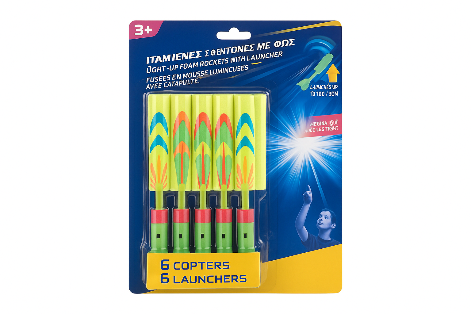 Zamislite osmehe na licima dece dok lansiraju ove šarene rakete visoko u vazduh! Idealno za grupnu igru, takmičenja u preciznosti ili jednostavno za zabavu. Penaste rakete su potpuno bezbedne i mogu se koristiti i u zatvorenom prostoru.